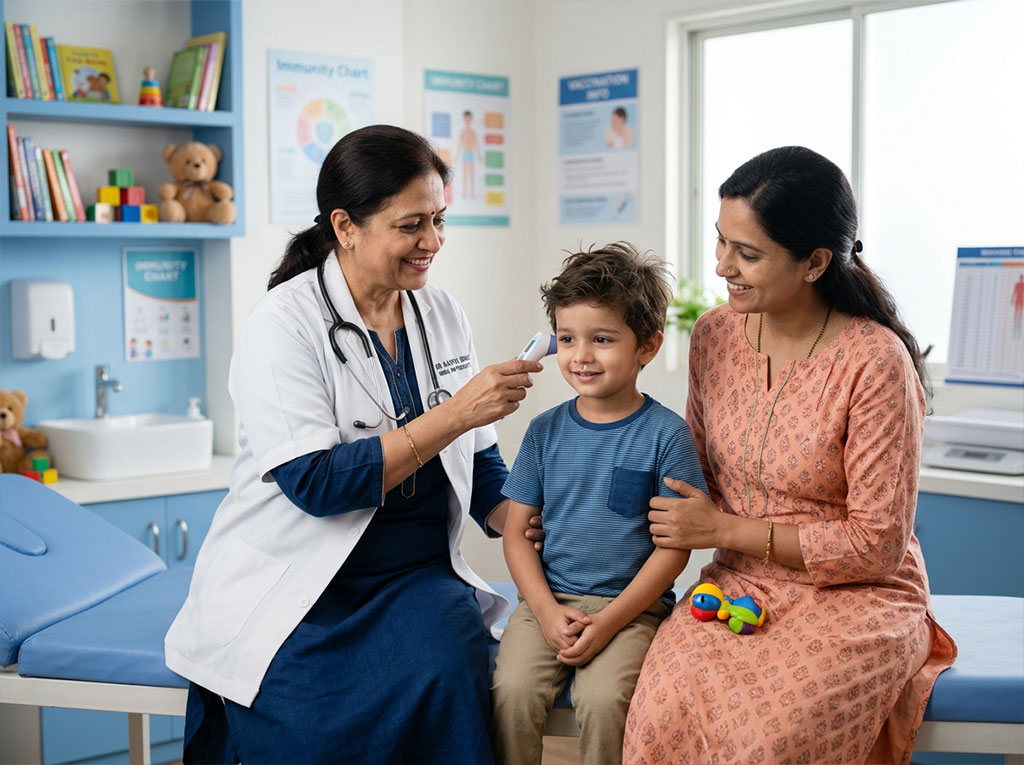 Urgent review is advisable if the child has breathing difficulty, persistent poor feeding, seizures, severe lethargy, dehydration, repeated vomiting, unusual drowsiness, bluish discoloration, or if the parent feels the child looks significantly unwell. In newborns and small infants, parents should maintain a low threshold for consultation.