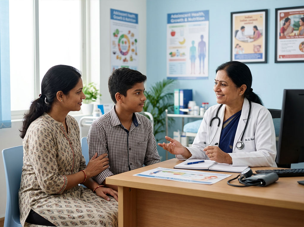 Support for puberty-related concerns, nutrition, menstrual health guidance, stress, lifestyle habits, growth issues, and preventive health counseling for teenagers.