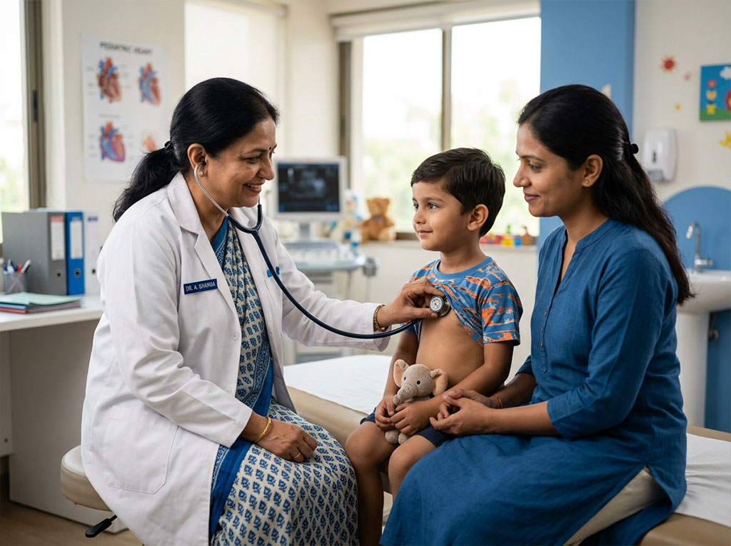 Child heart murmur evaluation, congenital heart disease screening, poor weight gain with cardiac suspicion, and referral for pediatric cardiac work-up when required.