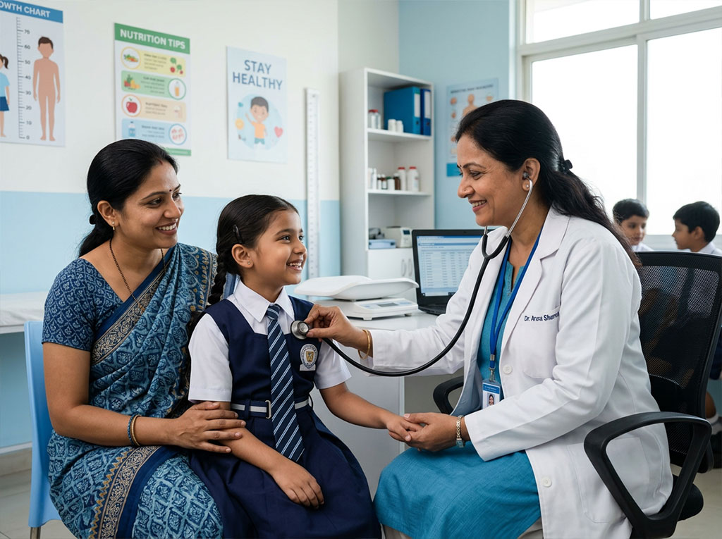 Yes. School health checkups can include growth monitoring, basic vision screening, nutrition review, general physical examination, and early identification of common issues that affect school-going children.